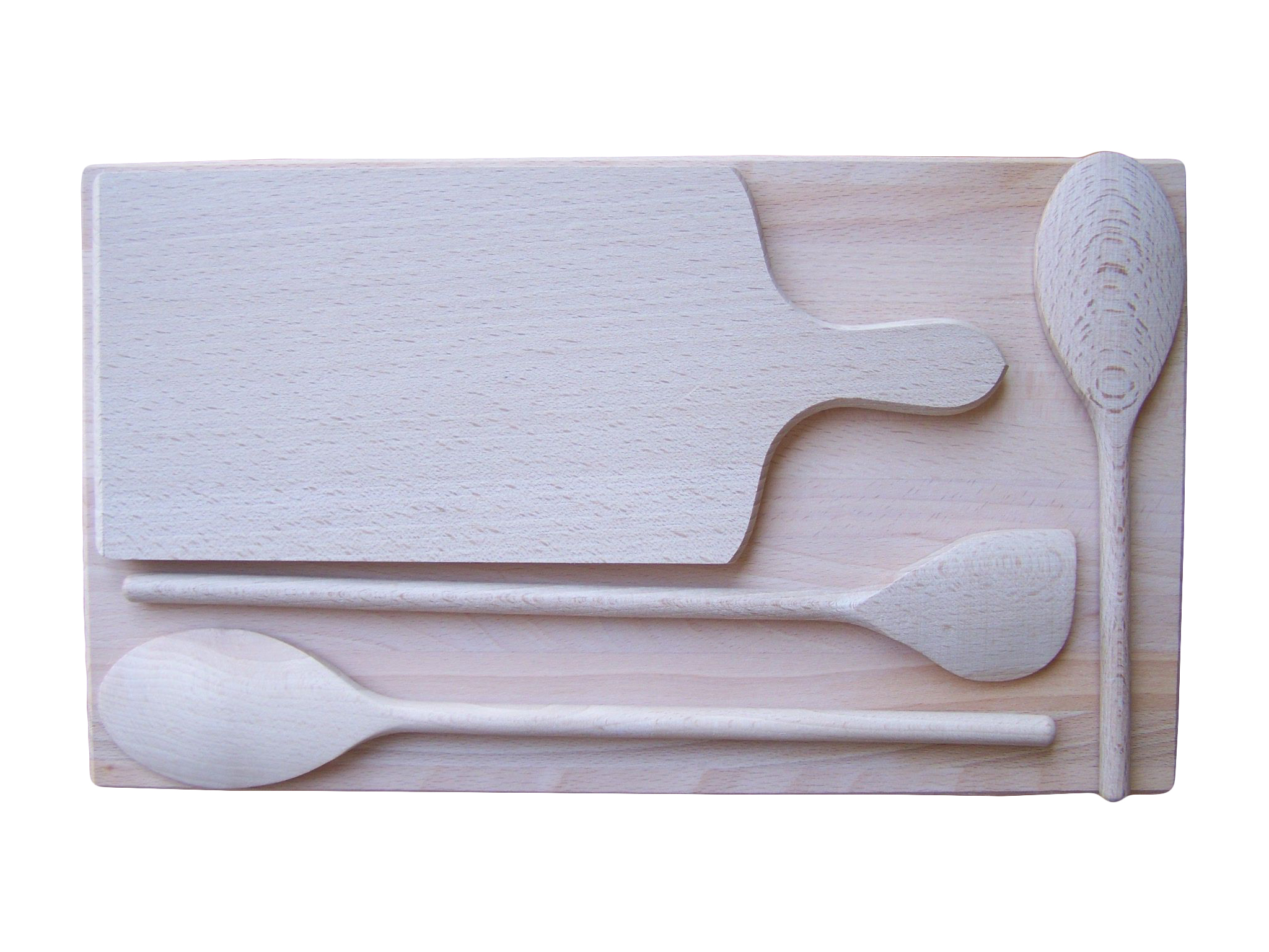Sada výrobků z bukového dřeva s FSC® certifikátem. Pro každodenní využití v kuchyni. Sada obsahuje prkénka 35x20 cm a 28x12 cm, 2x vařečku 30 cm a 1x vařečku 20 cm.