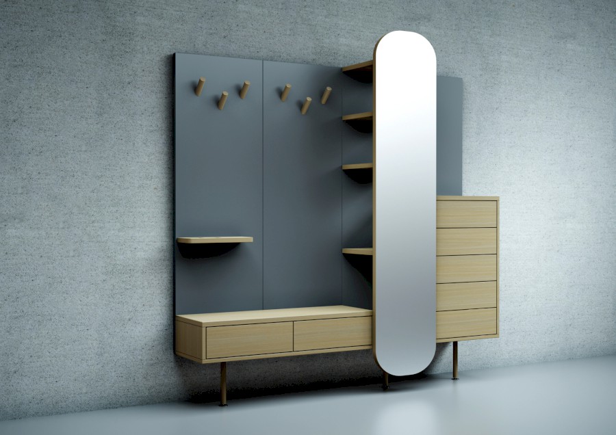 Funkční a minimalistická předsíňová stěna z přírodního dubového dřeva a zády z šedého lamina. Levostranná varianta šířky 186 cm. Doprava a montáž zdarma po celé ČR.
