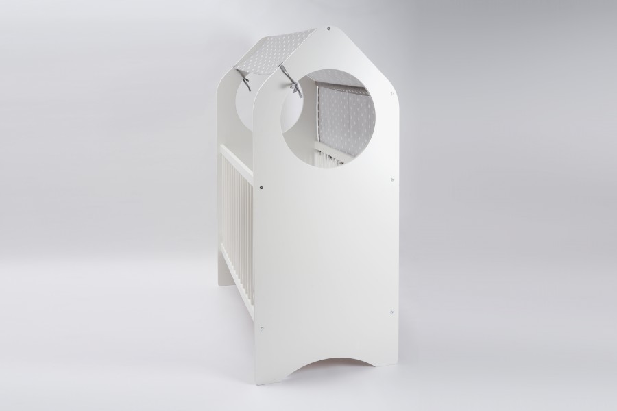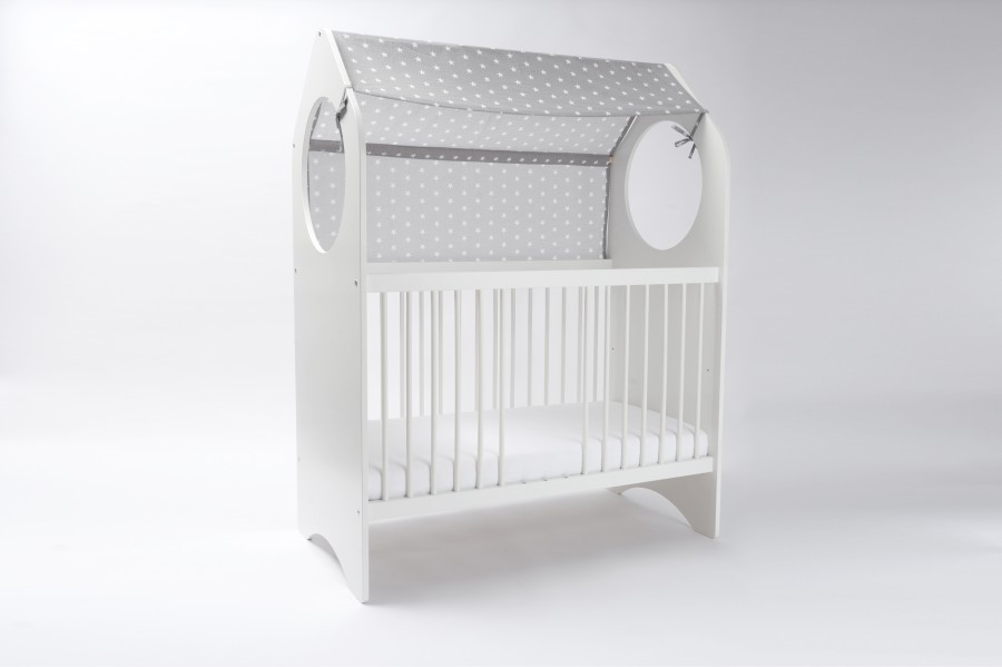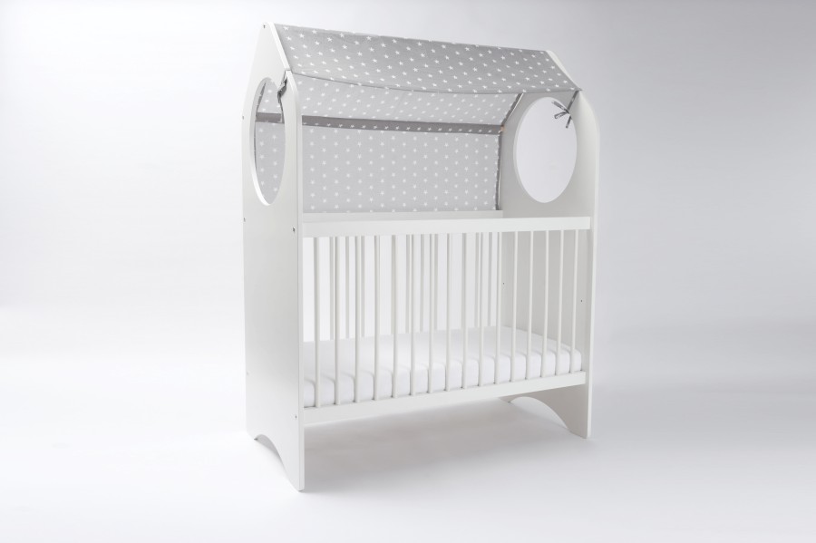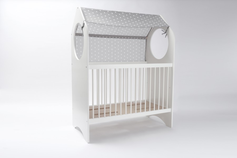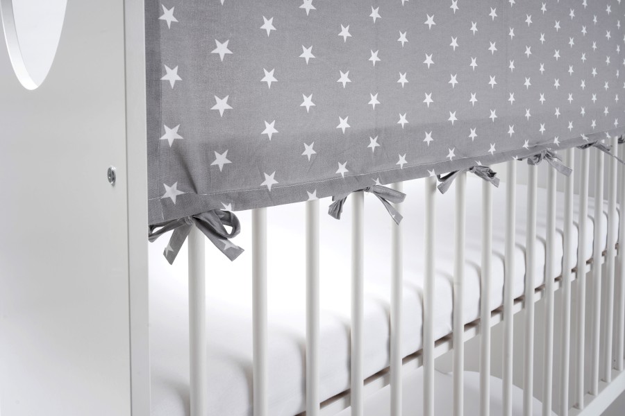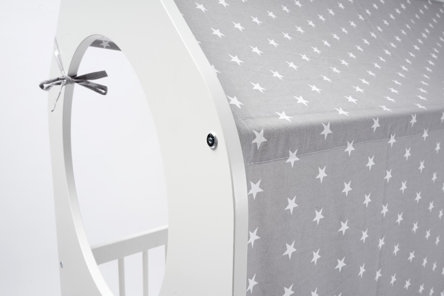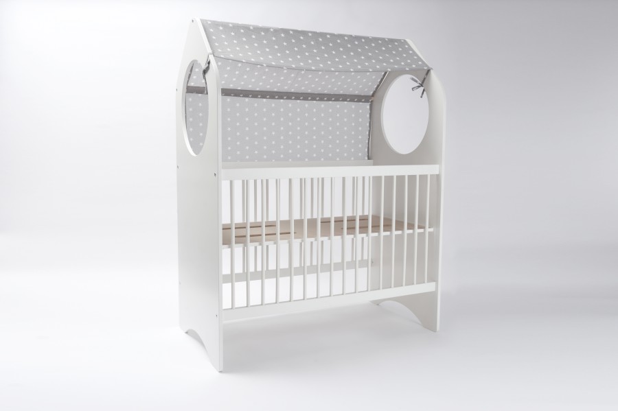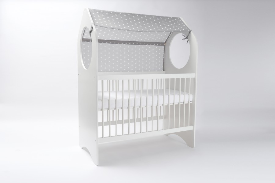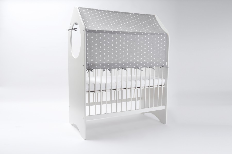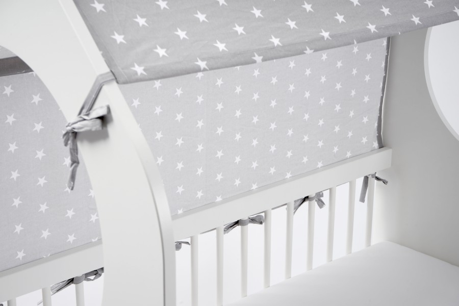 Postýlka v neutrální bílé barvě pro každý interiér dětského pokoje. Výškově stavitelný rošt. Možnost odstranění příček. Látková stříška s dekorem hvězdiček.