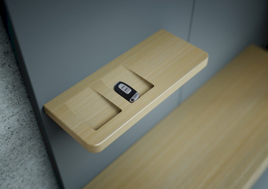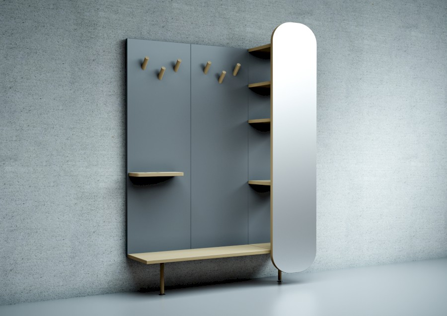 Funkční a minimalistická předsíňová stěna z přírodního dubového dřeva a zády z šedého lamina. Levostranná varianta šířky 138 cm, bez zásuvek. Doprava a montáž zdarma po celé ČR.